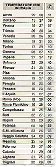 Le temperature nelle città italiane sono comprese, generalmente, tra la massima di 35 gradi C in piena estate e la minima di 0 gradi durante l'inverno. Solo raramente le temperature scendono sotto zero in città. Ecco un esempio delle temperature in Italia in un giorno di luglio: |